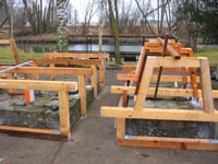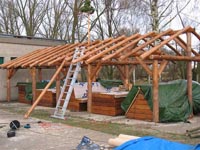Der Ausbau - wie es weiterging Ab 2008 begannen wir dann mit der Entkernung und Beräumung des Grundstückes. Die Betonfundamente der Motoren wurden mit Holz verkleidet und überdacht. So entstand eine rustikale Sitzecke, die zum Verweilen einlädt. Die Terrasse, über dem Wasser errichtet, ist stufenlos mit der Sitzecke verbunden. Der Lagerfeuerplatz sowie der kombinierte Grill- und Backofen schließen sich an. Im Juni 2008 wurde mit dem eigentlichen Ausbau bzw. Umbau der beiden Gebäude begonnen. Dabei war unser Hauptziel, in beiden Gebäuden insgesamt 4 einfache, funktionale und naturnahe Ferienwohnungen anzubieten.
